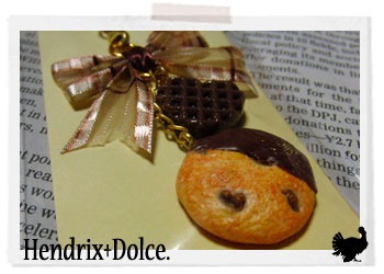 そしてチョコチップクッキーとハートチョコのストラップ。同じ様なお菓子を題材にして、同じ様な材料を使って作っても、やっぱり人によって作風が違いますよね!クッキーの質感といい、チョコの光沢といい…凄くリアル!勿体無くて使えません!って事で、現在フェルトケーキと共に飾らせて頂いております~!!